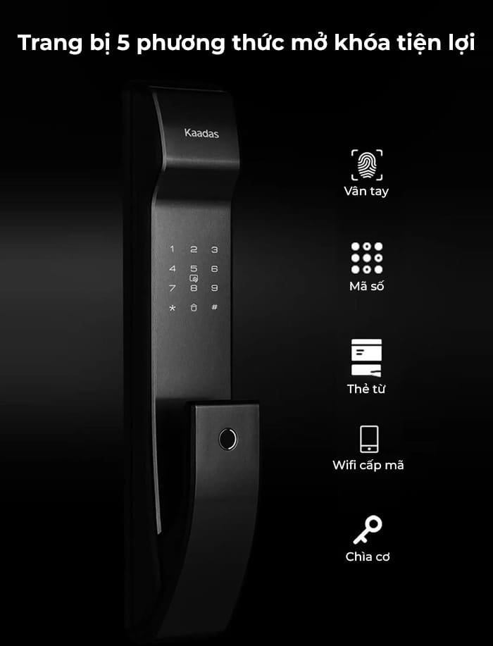 Khóa điện tử Kaadas K9-5W tích hợp nhiều phương pháp mở khóa tiên tiến như: Vân tay, mã số, thẻ từ, chìa cơ, app wifi.
