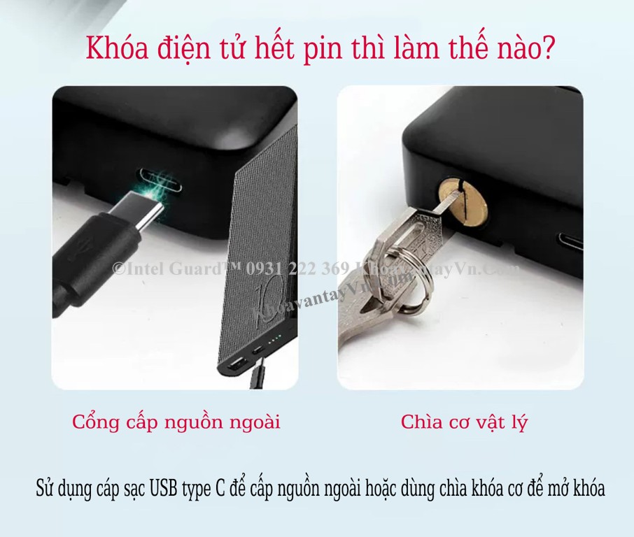 - Tích hợp chìa cơ cùng cổng cấp nguồn khẩn cấp type C dễ dàng kết nối nguồn ngoài để mở khóa trong những tình huống khẩn cấp, hết pin....