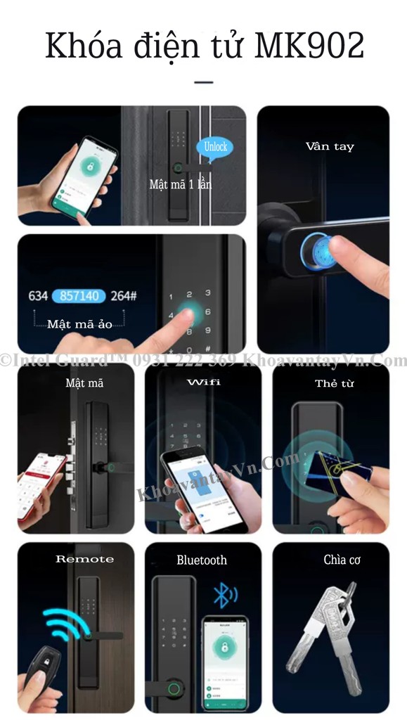 - Đa dạng phương thức mở khóa như vân tay, mật mã, thẻ từ, chìa cơ, app, remote (tùy chọn).....