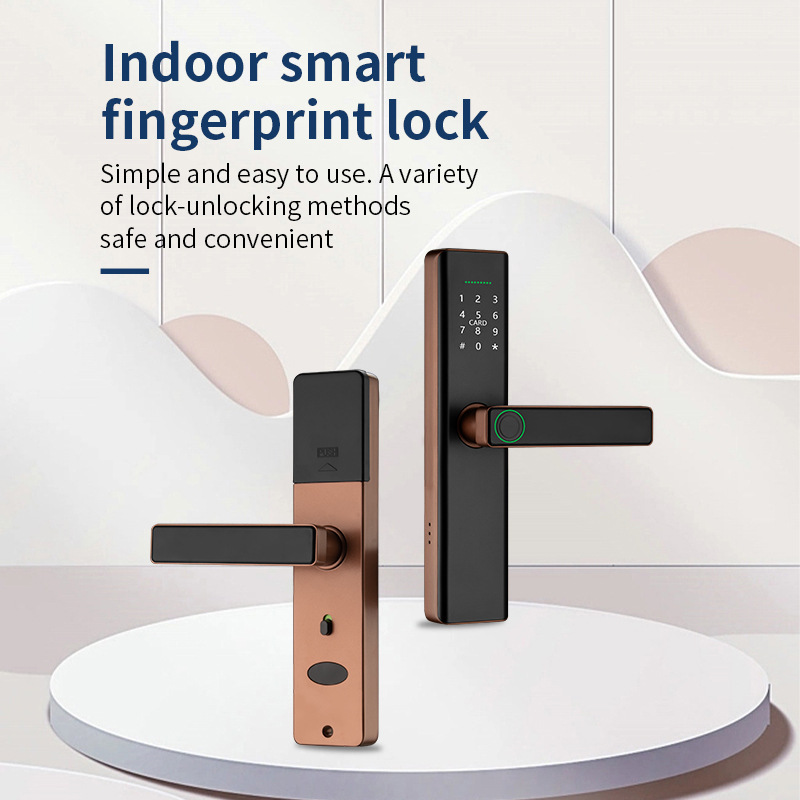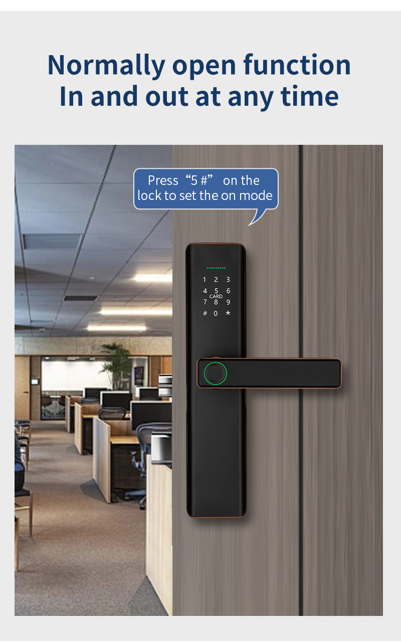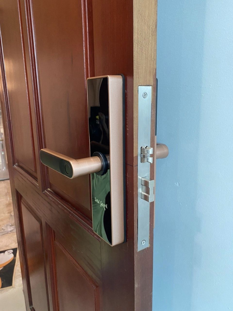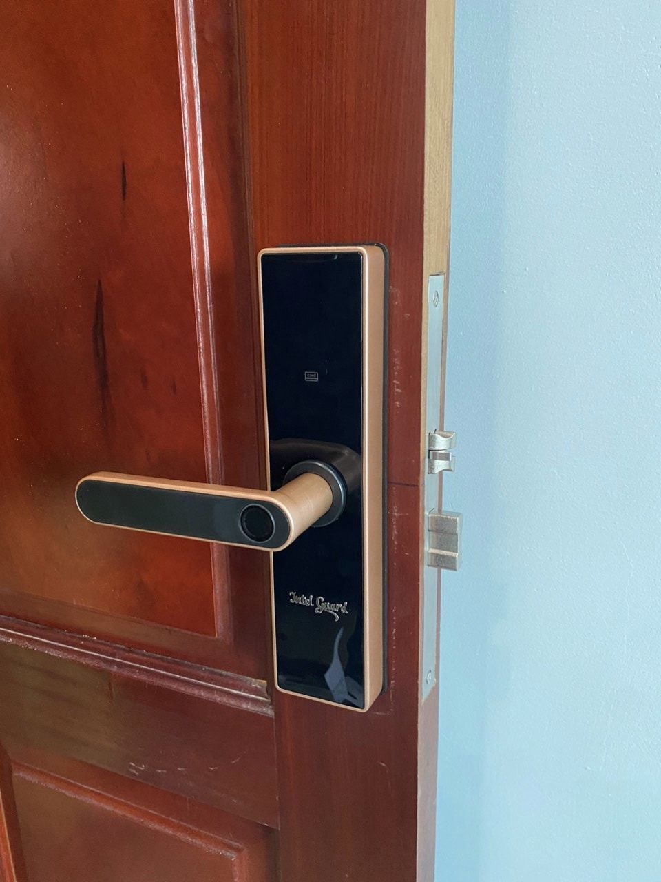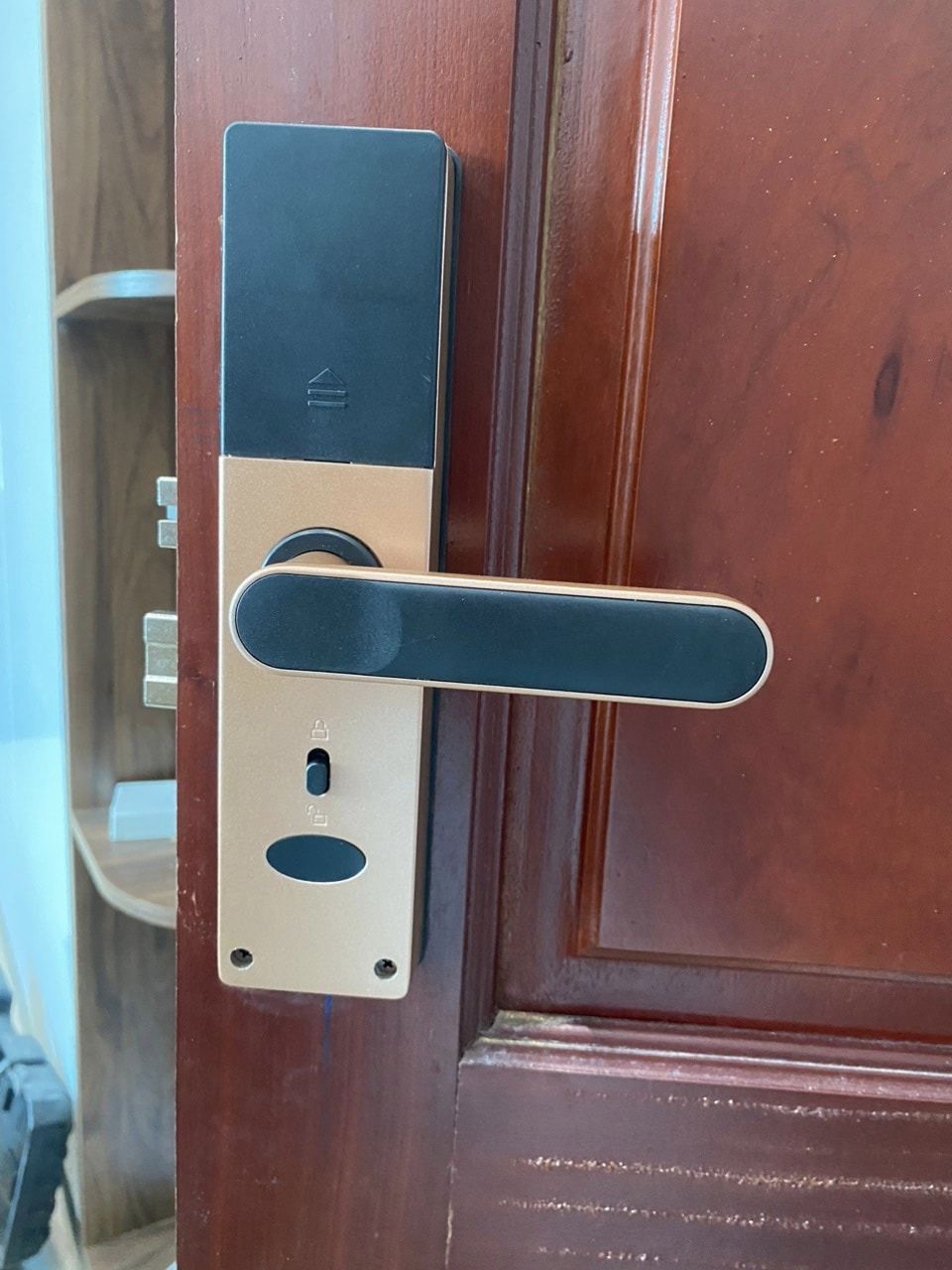 - Tích hợp nút khóa trái điện tử từ phía trong, khi chốt trong thì chỉ có vân tay, mật khẩu chủ hoặc điện thoại chủ mới có thể mở khóa.