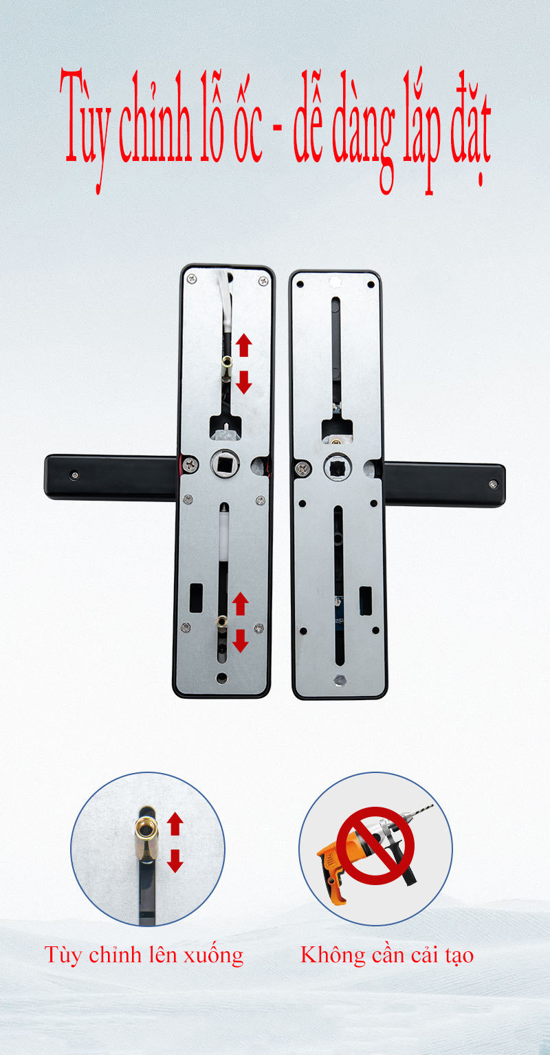 - Thiết kế lỗ ốc thông minh có thể điều chỉnh lên xuống dễ dàng lắp đặt. Thiết kế này rất thuận tiện khi thay khóa cũ sẽ không cần phải cải tạo, khoan thêm lỗ mới.