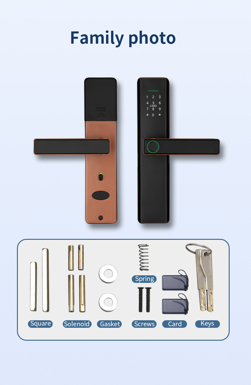 Khóa điện tử thông phòng MK810 có thiết kế mặt trước classic kiểu tay gạt truyền thống, phía trên cùng là bàn phím số cảm ứng được bảo vệ bởi kính cường lực giúp thao tác nhập liệu dễ dàng hơn, vân tay bán dẫn nằm ngay trên tay gạt mọi thao tác mở khóa được tối giản, chỉ cần chạm vân tay xác nhận rồi xoay tay gạt để mở cửa.