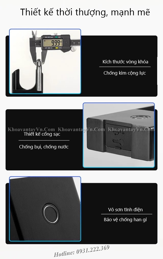 - Thân khóa làm bằng thép cứng , vỏ ngoài được sơn bằng công nghệ sơn tĩnh điện, chống ăn mòn tự nhiên, thiết kế cổng sạc ở phía dưới khóa, có nắp cao su ngăn bụi, nước để nâng cao tuổi thọ khi dùng ngoài trời.