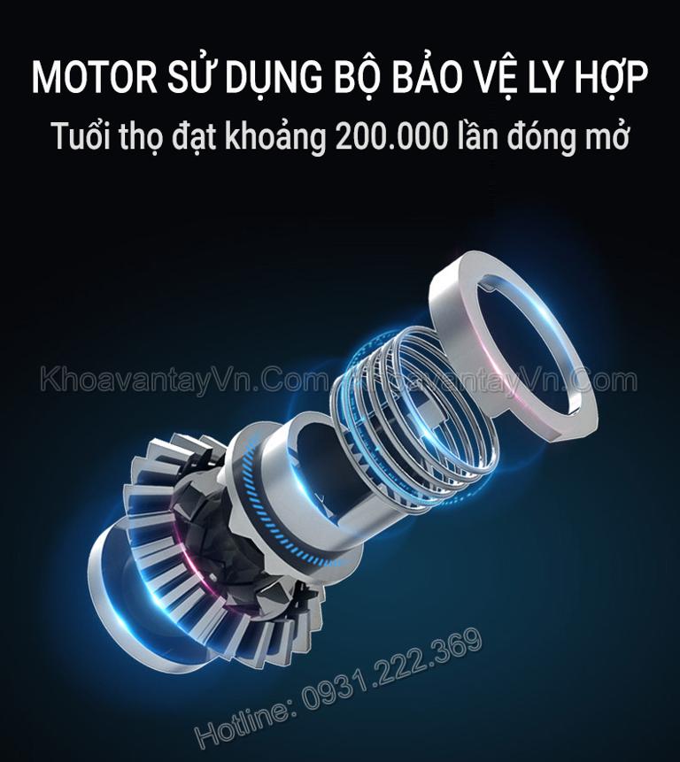 Cải tiến thứ 3 đến từ motor điều khiển đóng mở khóa. Đây là một trong những chi tiết quan trọng nhất của mỗi chiếc khóa bởi thao tác mở hay khóa đều phải thông qua motor. Nếu motor chất lượng kém sẽ khiến bạn không thể mở hay khóa cửa được. Khóa thông minh cửa kính thường có chế độ tự động khóa mỗi khi 2 cánh cửa khép lại với nhau mà cửa kính dạng mở thường sử dụng bản lề âm sàn, sau một thời gian sử dụng bản lề dễ bị lệch khiến 2 cánh cửa không còn khít, cân với nhau nữa. Khi đó chốt khóa sẽ không đóng được vào vị trí cửa bị kênh hoặc sẽ bị kê chốt khóa mỗi khi mở khóa, thao tác này lâu ngày sẽ gây hại cho motor. Nhưng với khóa vân tay thông minh cửa kính MK189 bạn không còn phải lo về việc đó nữa, bởi motor của khóa sử dụng bộ bảo vệ ly hợp, mỗi khi gặp vật cản hoặc bị kê chốt khóa thì motor sẽ tự phát hiện và dừng mọi hoạt động cho tới khi không có vật cản hay chốt khóa ở trạng thái tự do thì motor mới hoạt động lại. Ngoài ra tuổi thọ của motor cũng được tăng lên tới 200.000 lần đóng mở. Thử tính mỗi ngày bạn mở khóa khoảng 50 lần thì tuổi thọ motor có thể đến 10 năm sử dụng.